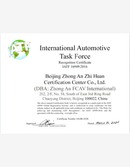 北京中安质环认证中心有限公司喜获IATF16949认证机构资质